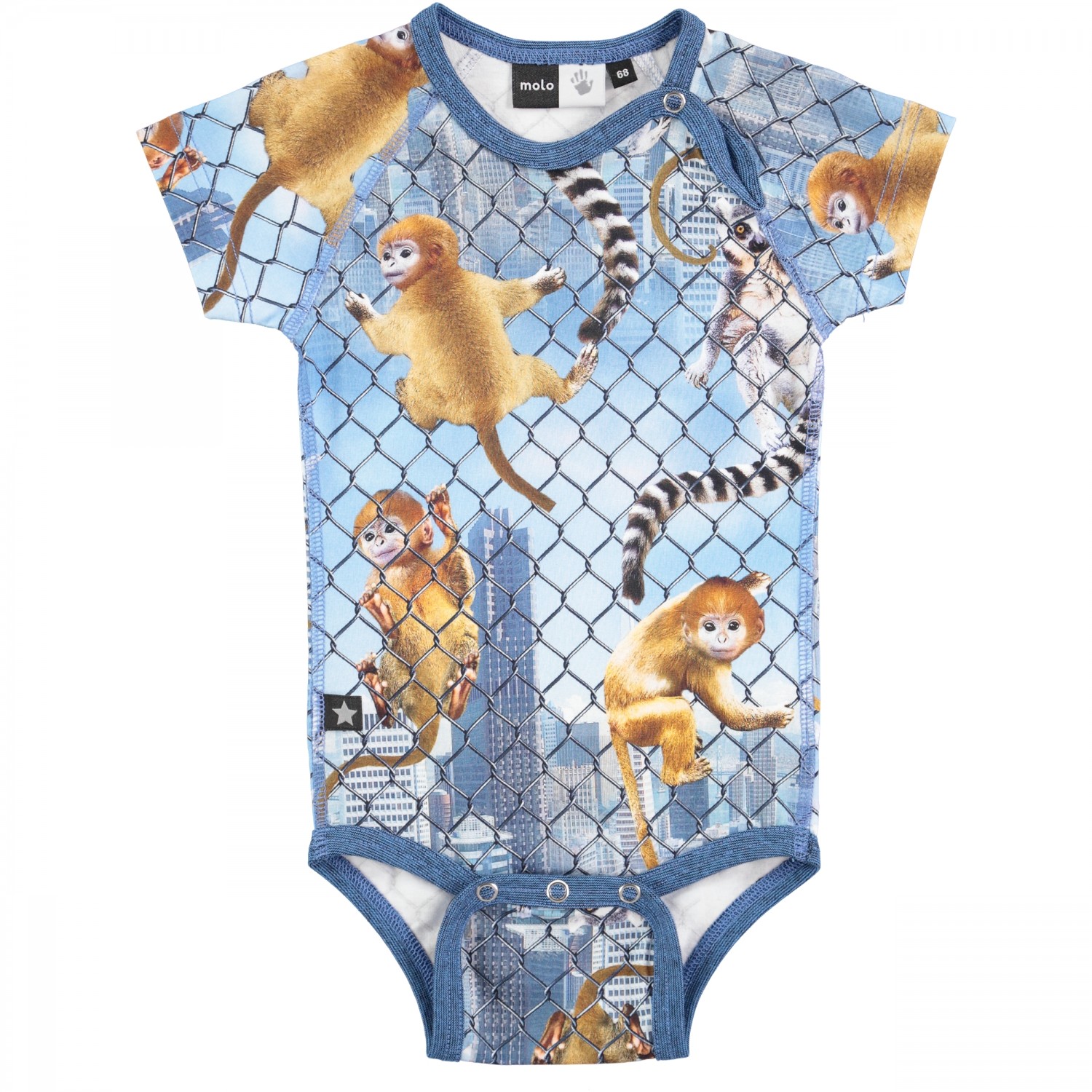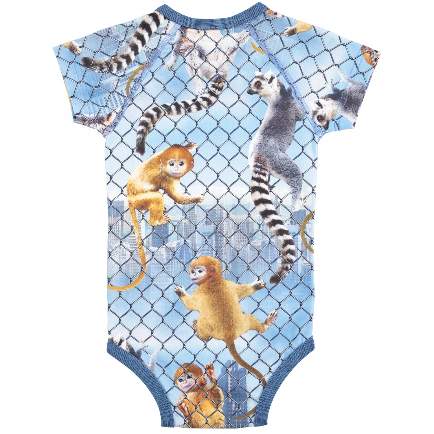 Krátkorukávové body s digitálnou potlačou šplhajúcich sa opičiek. Pri krku a medzi nôžkami sú cvočky pre ľahšie obliekanie. Materiál: 95% bavlna 5% elastan. Materiál má Oeko-Tex certifikát.