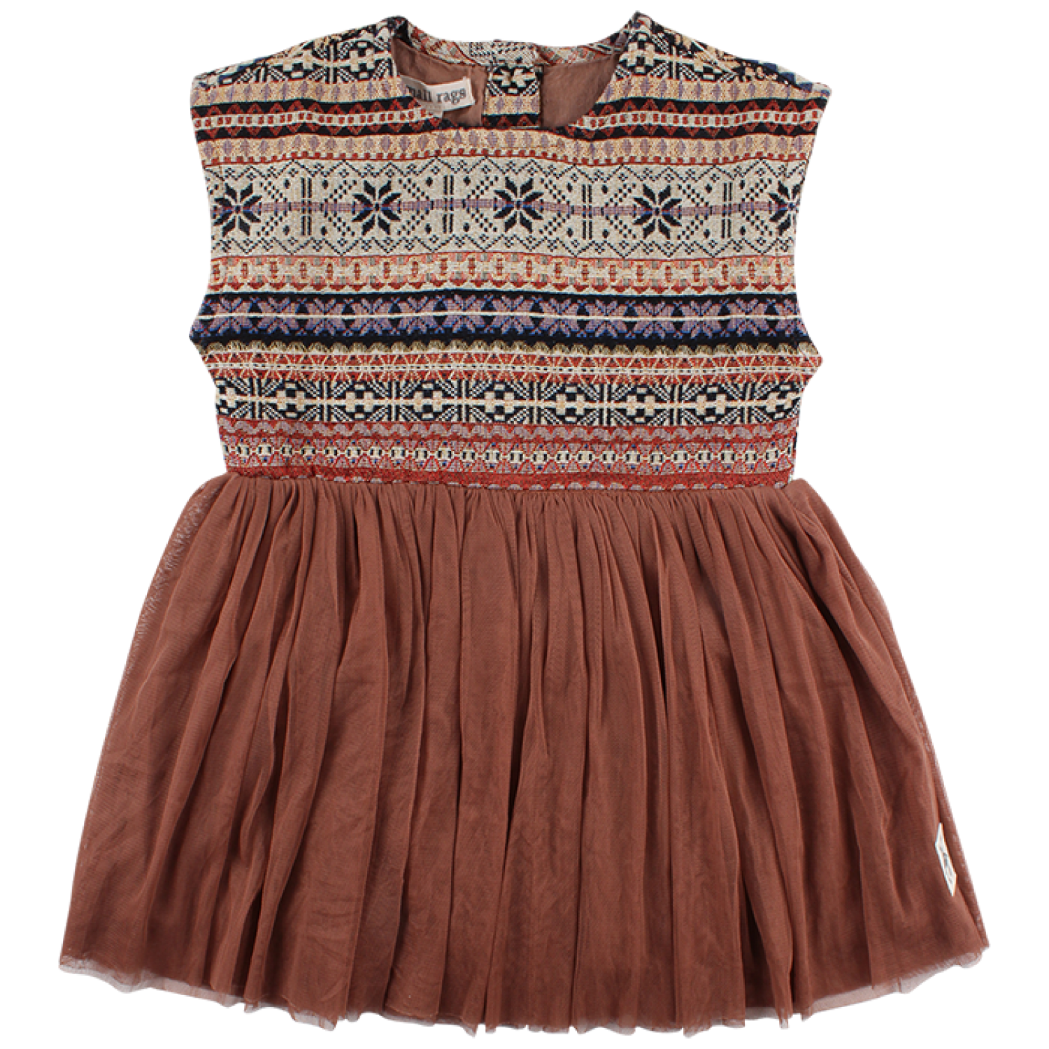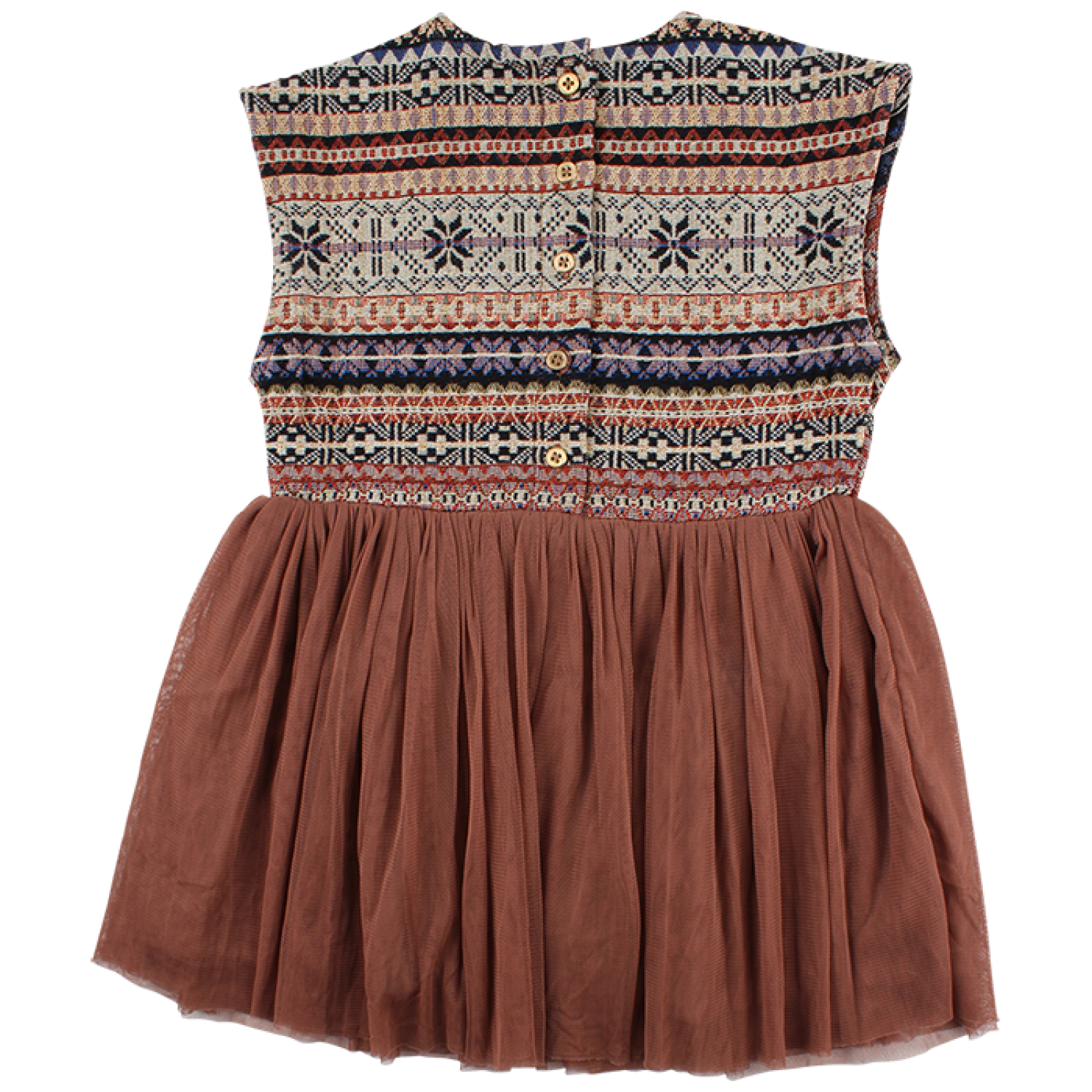 Slávnostné šatičky s ornamentovým vzorom zaujmú každú malú parádnicu. Celé sú podšité orieškovohnedou bavlnou. Spodná časť šatočiek sa skladá z dvoch vrstiev jemného orieškovohnedého tylu. Vzadu sa zapínajú na 5 zlatých gombíčkov v strede chrbta. Zloženie: 50% bavlna 50% polyester.