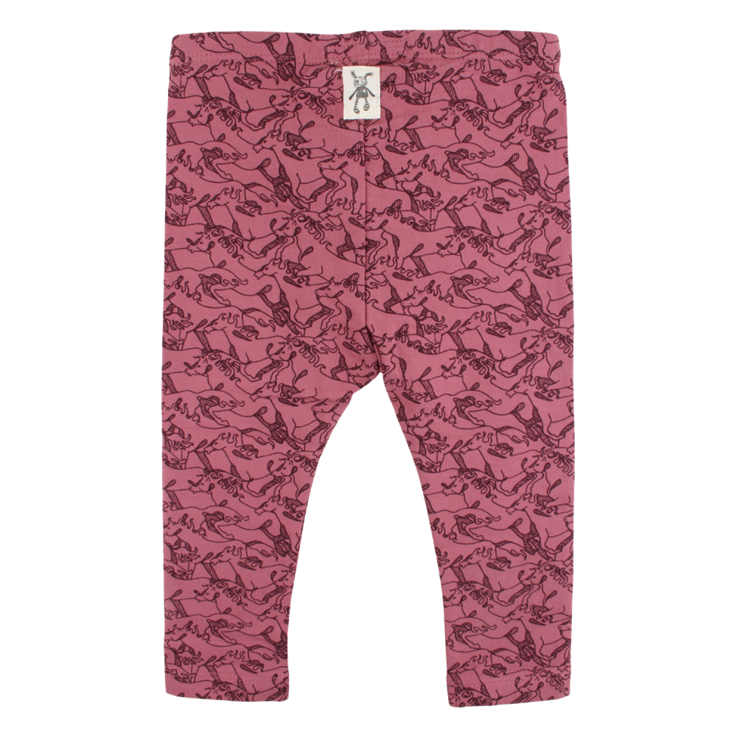 Elastické legínky tlmenej fuchsiovej farby sú posiate stádom cválajúcich koní. Materiál: 95% bavlna 5% elastan.